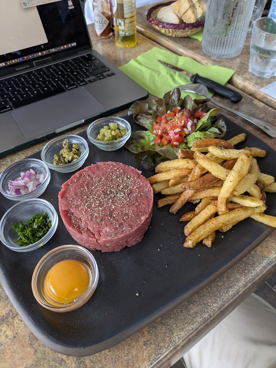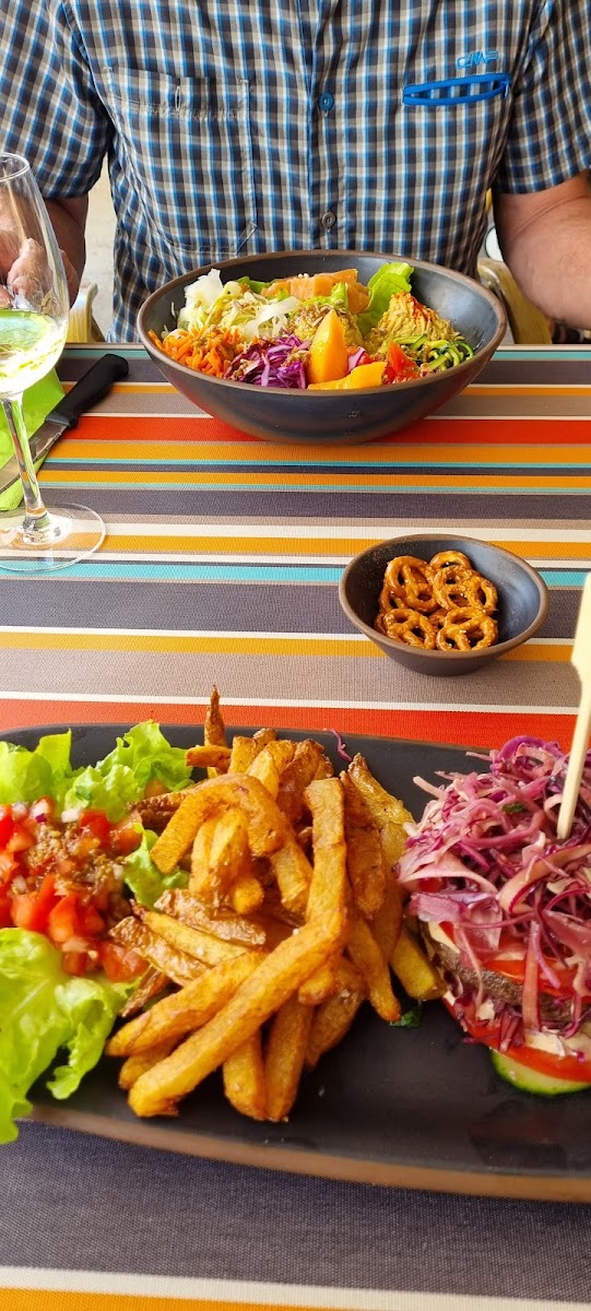 Het was even zoeken om een restaurant te vinden in de buurt, maar deze zaak trok meteen onze aandacht door de sfeervolle aankleding en aangename muziek. Binnen was er ook nog een charmant winkeltje waar lokale kunstenaars hun creaties verkopen, een leuke extra touch! Het eten was erg lekker. Ik had La Surprise, en dat bleek een goede keuze. De frietjes van het huis waren ook bijzonder goed. De bediening was vriendelijk en aangenaam, wat de ervaring extra prettig maakte. Een klein puntje van kritiek: de gebakken courgette was koud. Misschien was dat de bedoeling, maar in mijn hoofd klopte het niet helemaal. Toch was de smaak goed, en met 26 graden buiten was het eigenlijk best oke. Kortom: zeker een aanrader! Smakelijk groet, S&B